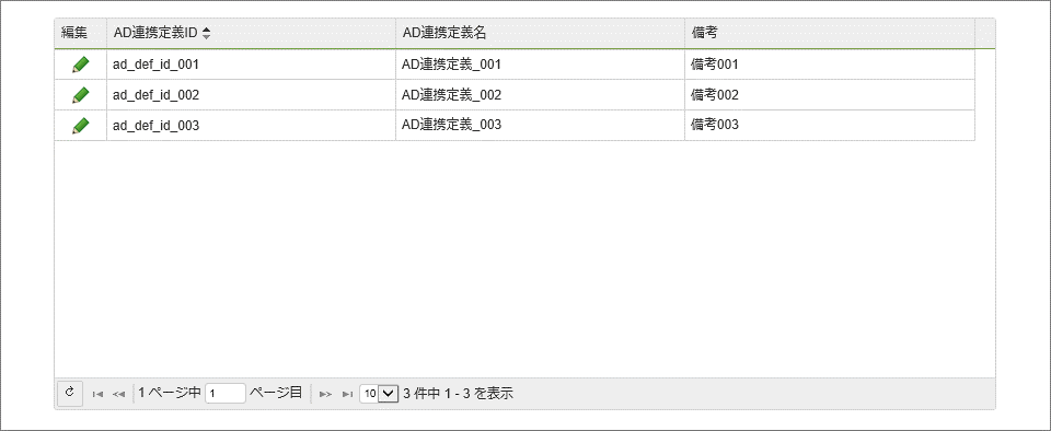 検索結果を表示しています。 編集アイコン 編集アイコンを表示します。 編集アイコンをクリックすると、選択されたAD連携定義のAD連携定義編集画面に遷移します。 AD連携定義ID AD連携定義IDを表示します。 AD連携定義名 AD連携定義名を表示します。