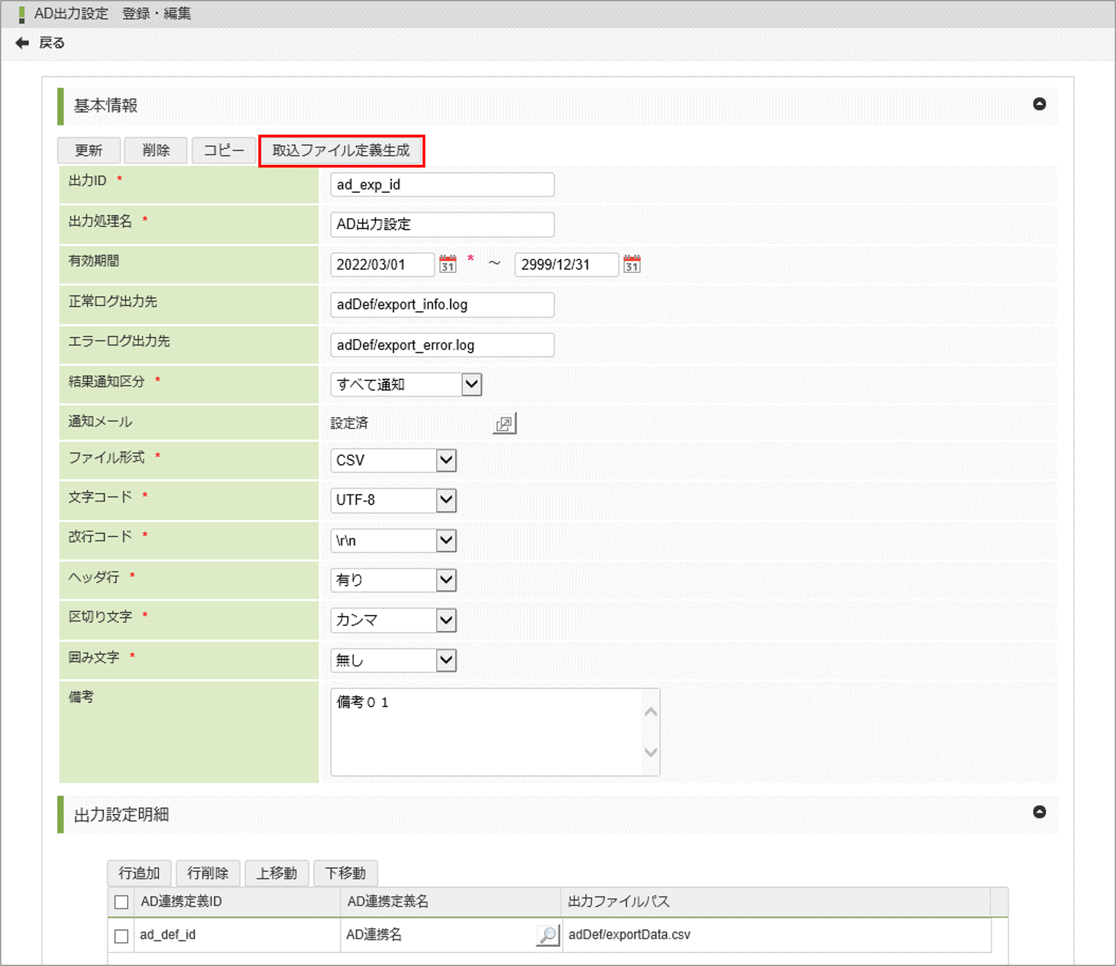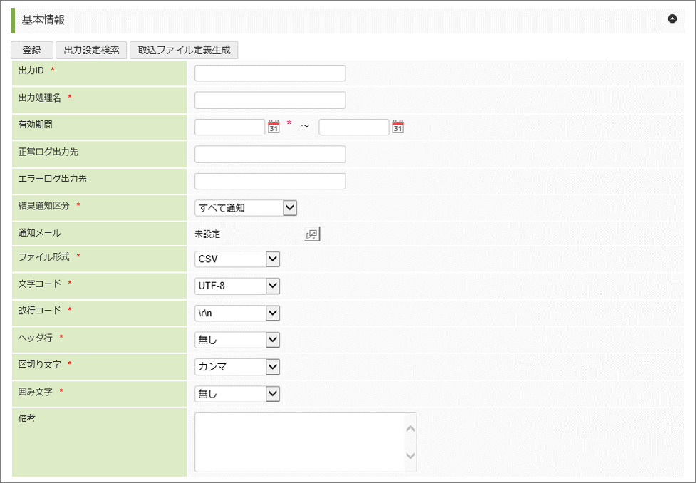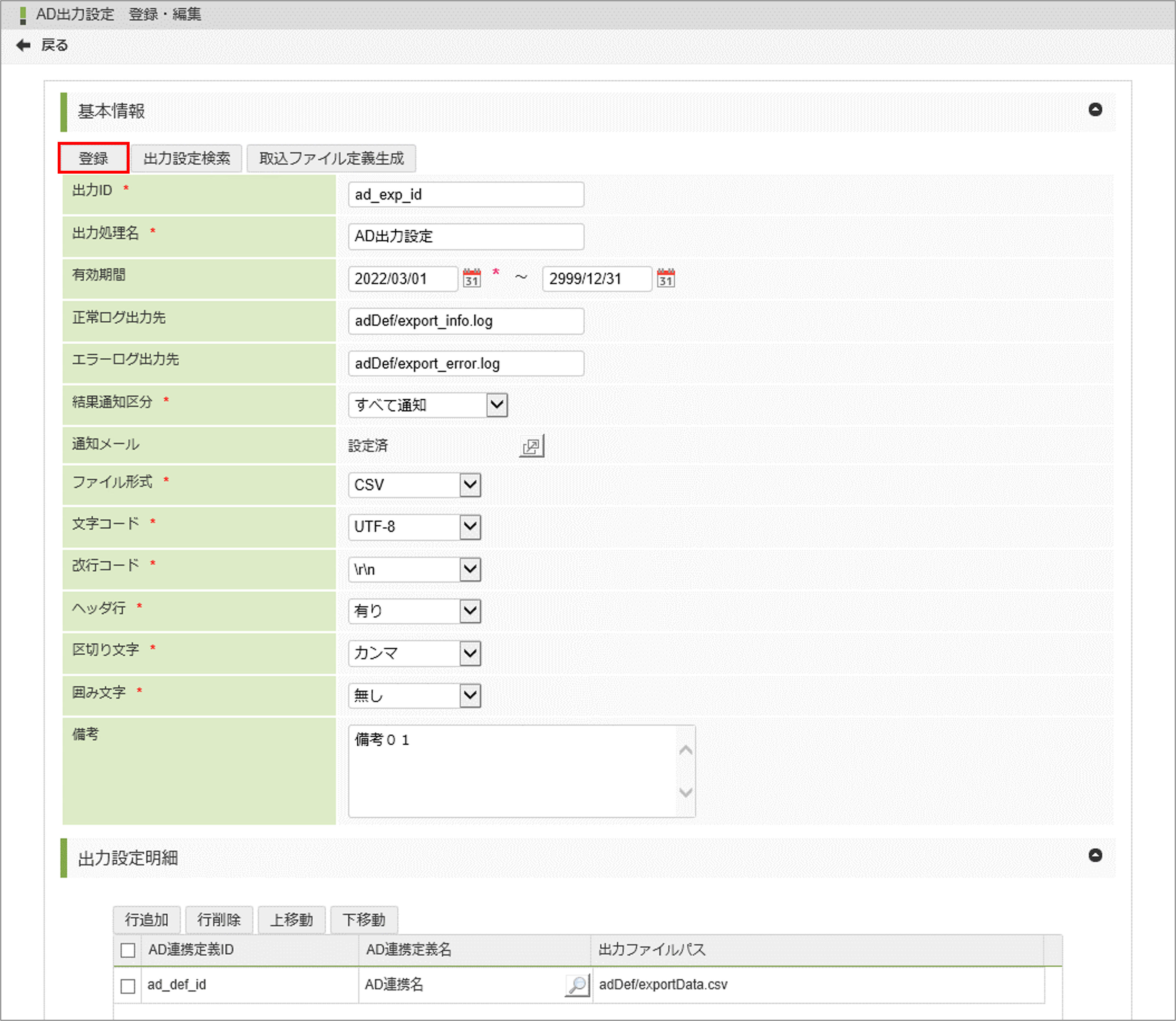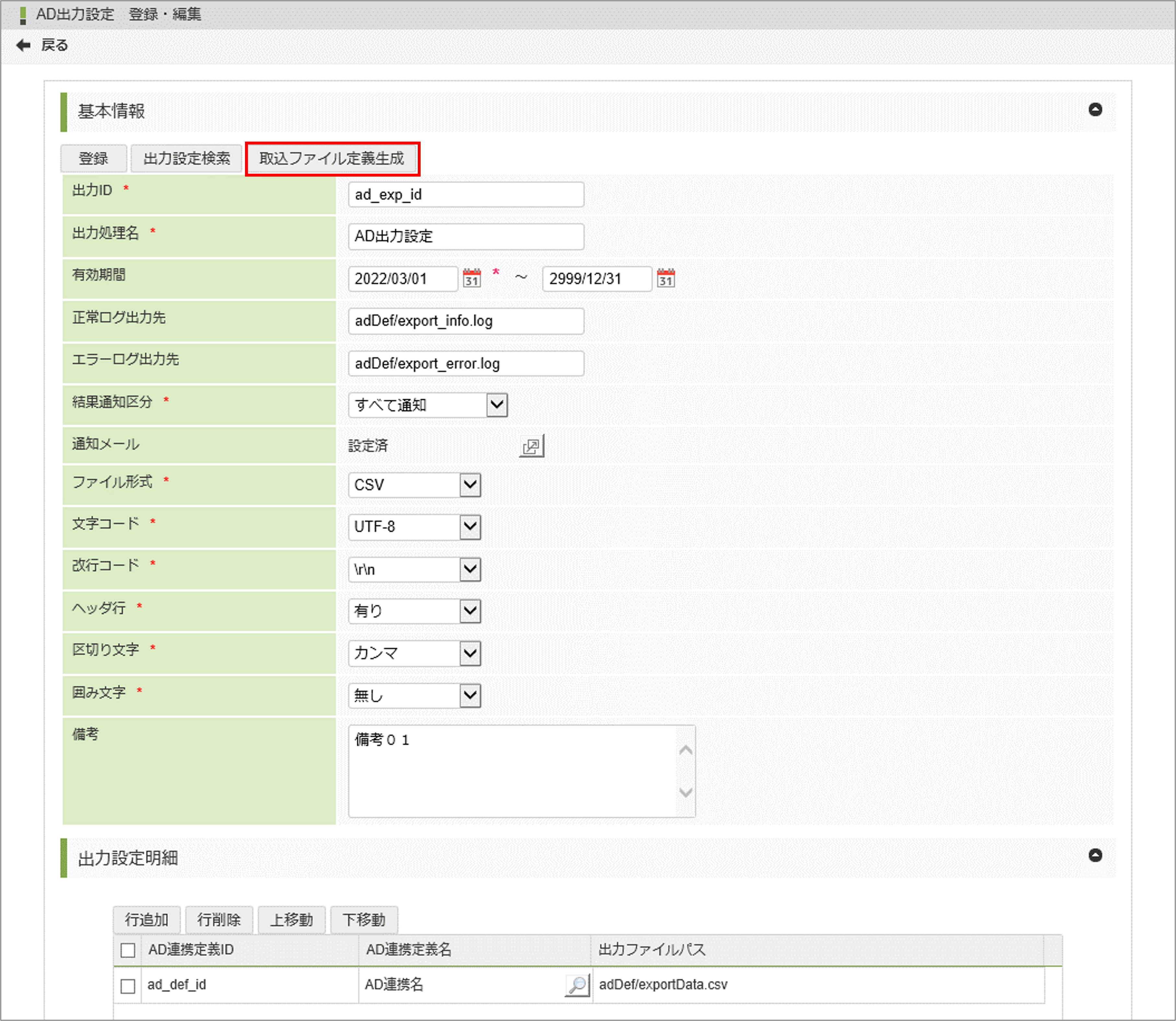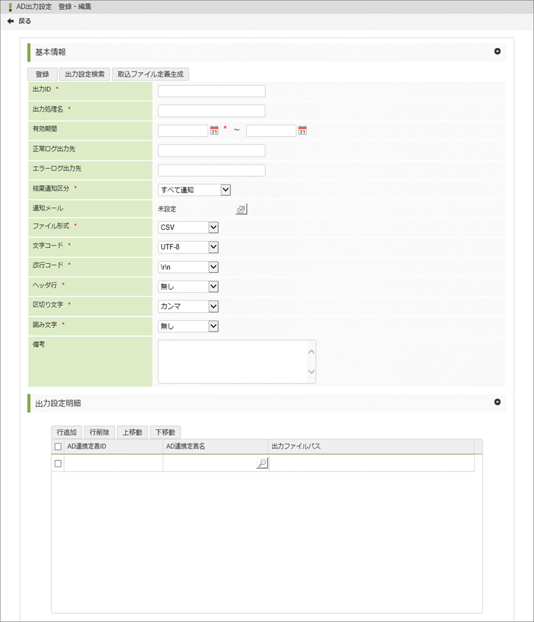 登録ボタン登録ボタンをクリックすると、設定されている情報で登録処理を実行します。 出力設定検索ボタン出力設定検索ボタンをクリックすると、AD出力設定検索画面が表示され、選択されたAD出力設定の出力IDと出力処理名以外の内容を反映します。 取込ファイル定義生成ボタン取込ファイル定義生成ボタンをクリックすると出力設定明細で選択されたAD連携定義の項目明細を基に取込ファイル定義を作成します。 出力ID(必須)出力IDを入力します。 出力処理名(必須)出力処理名を入力します。 有効期間 開始日(必須)有効期間 開始日を設定します。 有効期間 終了日(任意)有効期間 終了日を設定します。未設定のまま登録した場合、intra-mart上のシステム最大日付が自動的に登録されます。 正常ログ出力先(任意)正常ログ出力先を入力します。 エラーログ出力先(任意)エラーログ出力先を入力します。 結果通知区分(必須)結果通知区分を選択します。 通知メール(条件必須/編集可)通知メール設定状態が表示されます。設定アイコンをクリックすると、通知メール設定画面がポップアップ表示され通知メールを設定することができます。結果通知区分で「通知しない」を選択した場合でも通知メールのみ設定することも可能です。但し、結果通知区分で「通知しない」以外を選択した場合は、通知メール設定画面で「送信先メールアドレス」の「To:」に1件以上設定する必要があります。 ファイル形式(必須)ファイル形式を選択します。 文字コード(必須)文字コードを選択します。 改行コード(必須)改行コードを選択します。 ヘッダ行(必須)ヘッダ行の有無を選択します。 区切り文字(必須)区切り文字を選択します。 囲み文字(必須)囲み文字を選択します。 備考(任意)備考を入力します。