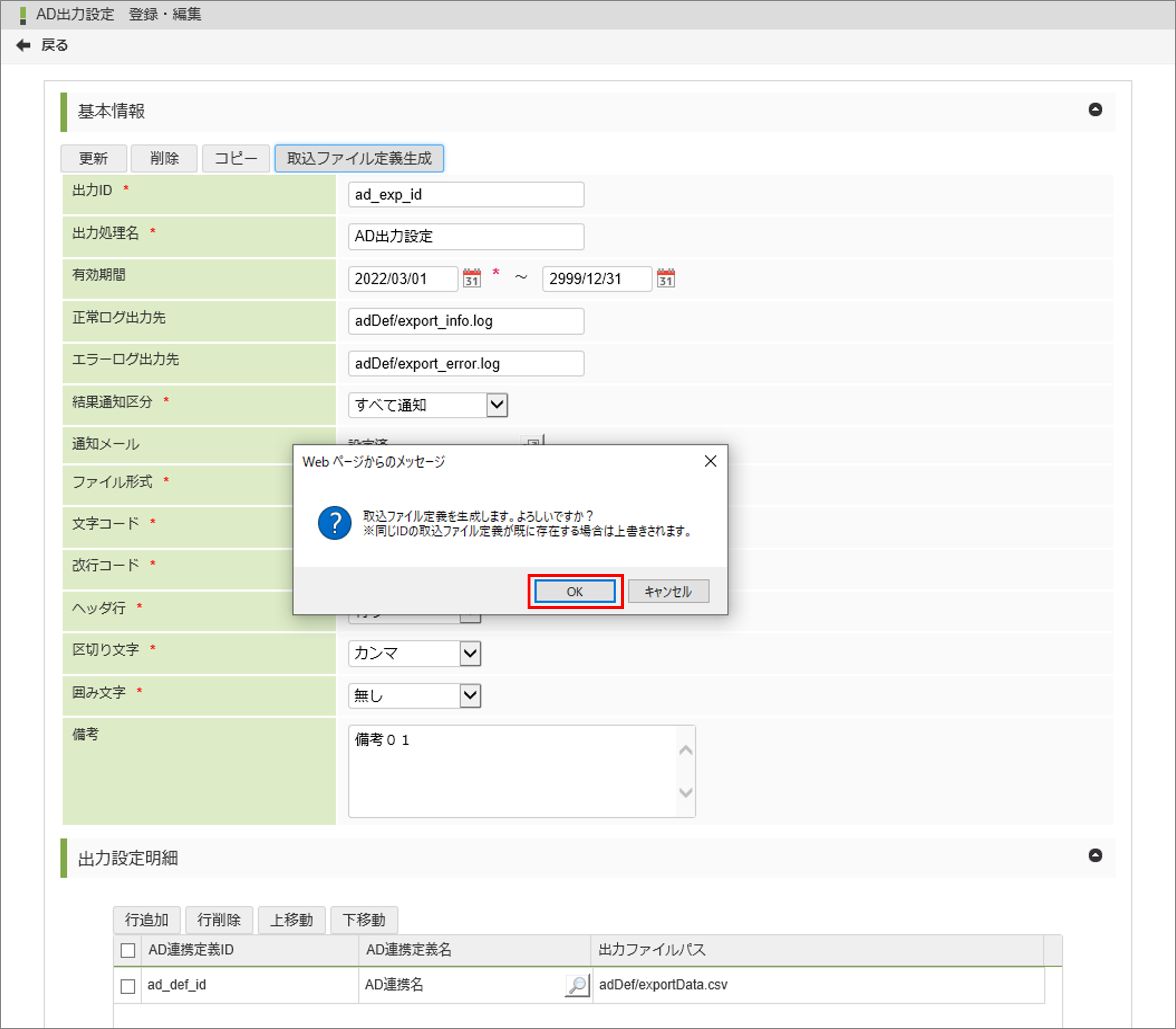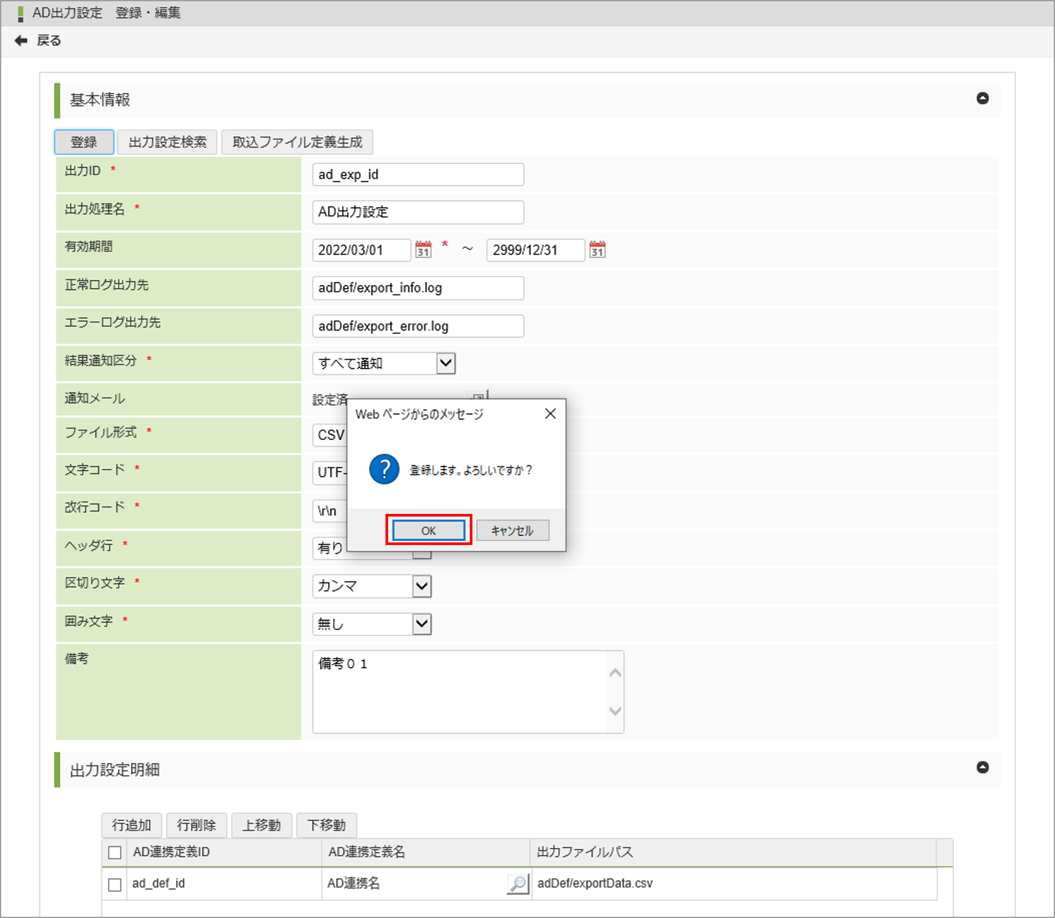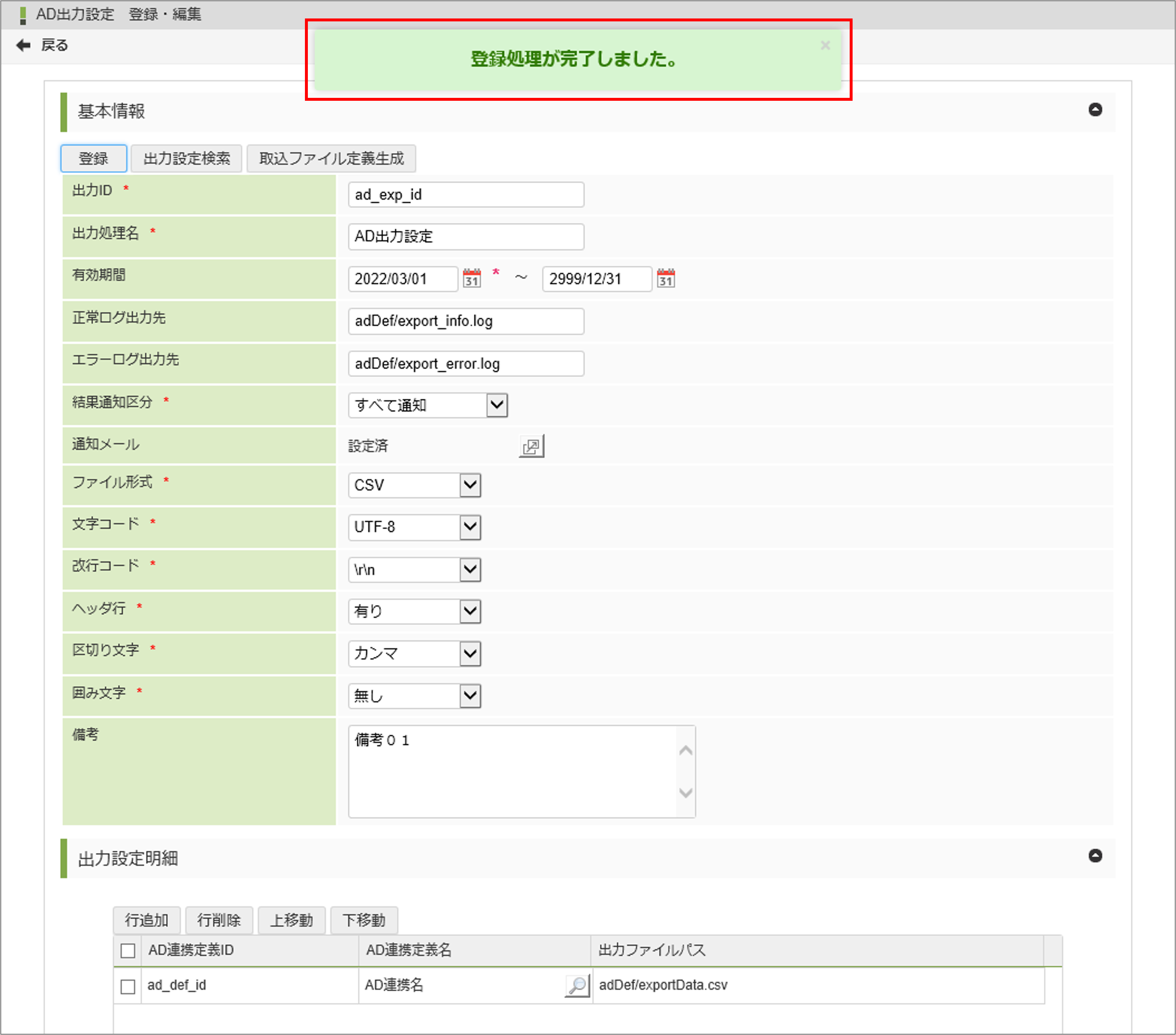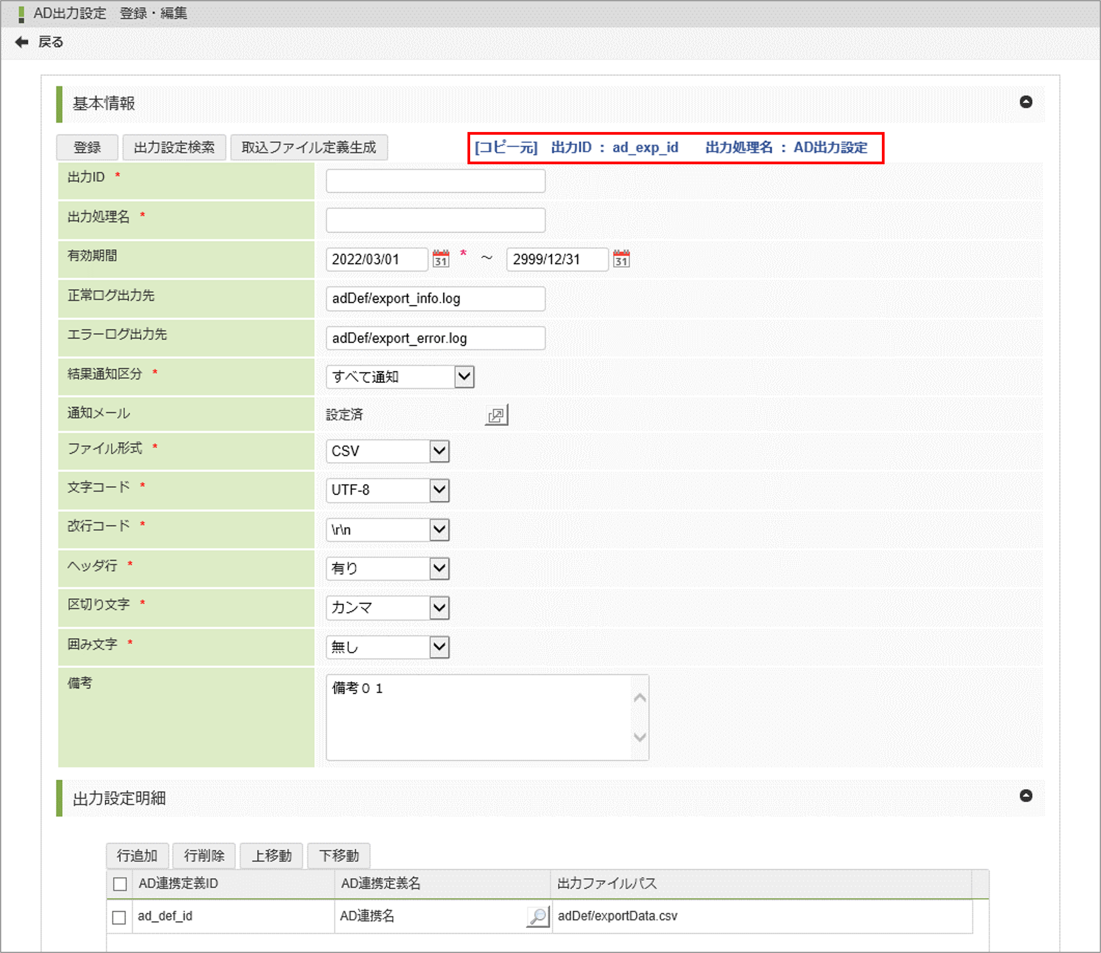 登録ボタン登録ボタンをクリックすると、設定されている情報で登録処理を実行します。 出力設定検索ボタン出力設定検索ボタンをクリックすると、AD出力設定検索画面が表示され、選択されたAD出力設定の出力IDと出力処理名以外の内容を反映します。 取込ファイル定義生成ボタン取込ファイル定義生成ボタンをクリックすると出力設定明細で選択されたAD連携定義の項目明細を基に取込ファイル定義を作成します。 出力ID(必須)出力IDを入力します。 出力処理名(必須)出力処理名を入力します。 有効期間 開始日(必須)有効期間 開始日を設定します。 有効期間 終了日(任意)有効期間 終了日を設定します。未設定のまま登録した場合、intra-mart上のシステム最大日付が自動的に登録されます。 正常ログ出力先(任意)正常ログ出力先を入力します。 エラーログ出力先(任意)エラーログ出力先を入力します。 結果通知区分(必須)結果通知区分を選択します。 通知メール(条件必須/編集可)通知メール設定状態が表示されます。設定アイコンをクリックすると、通知メール設定画面がポップアップ表示され通知メールを設定することができます。結果通知区分で「通知しない」を選択した場合でも通知メールのみ設定することも可能です。但し、結果通知区分で「通知しない」以外を選択した場合は、通知メール設定画面で「送信先メールアドレス」の「To:」に1件以上設定する必要があります。 ファイル形式(必須)ファイル形式を選択します。 文字コード(必須)文字コードを選択します。 改行コード(必須)改行コードを選択します。 ヘッダ行(必須)ヘッダ行の有無を選択します。 区切り文字(必須)区切り文字を選択します。 囲み文字(必須)囲み文字を選択します。 備考(任意)備考を入力します。