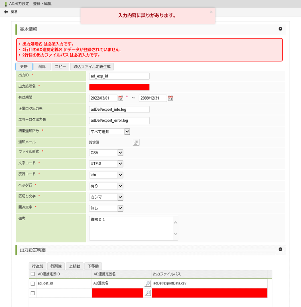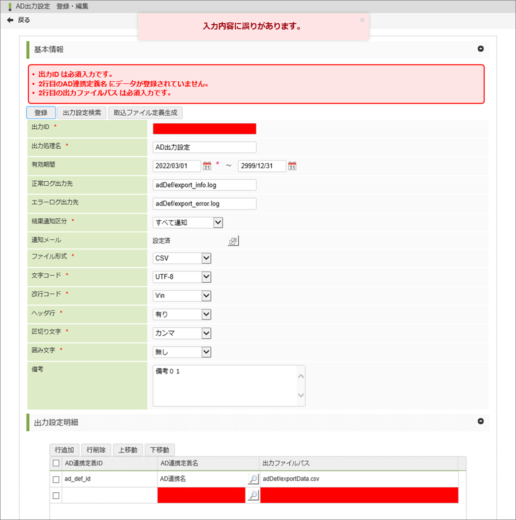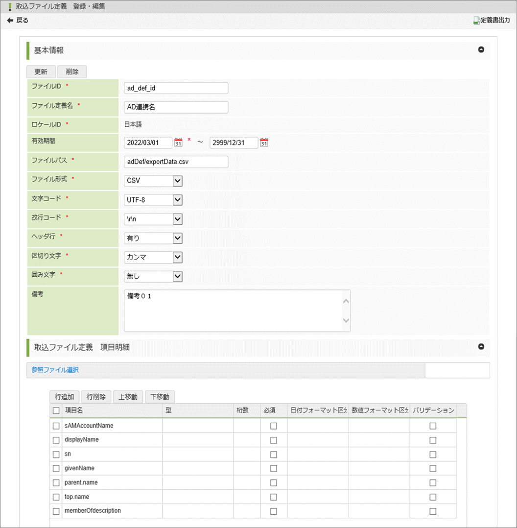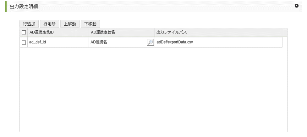 行追加ボタン行追加ボタンをクリックすると、設定明細に空の行を追加します。 行削除ボタン行削除ボタンをクリックすると、選択されている行を削除します。 上移動ボタン上移動ボタンをクリックすると、選択されている行を上移動します。 下移動ボタン下移動ボタンをクリックすると、選択されている行を下移動します。 設定明細ヘッダー部全選択チェックボックスチェックボックスをクリックすると、全ての行の選択/未選択状態を切り替えます。 選択チェックボックスチェックボックスをクリックすると、選択行の選択/未選択状態を切り替えます。 AD連携定義IDAD連携定義に設定されているAD連携定義IDを表示します。 AD連携定義名(必須)検索アイコンをクリックすると、AD連携定義検索画面がポップアップ表示し、選択されたAD連携定義名が反映されます。 出力ファイルパス(必須)CSV出力先ファイルパスを設定します。