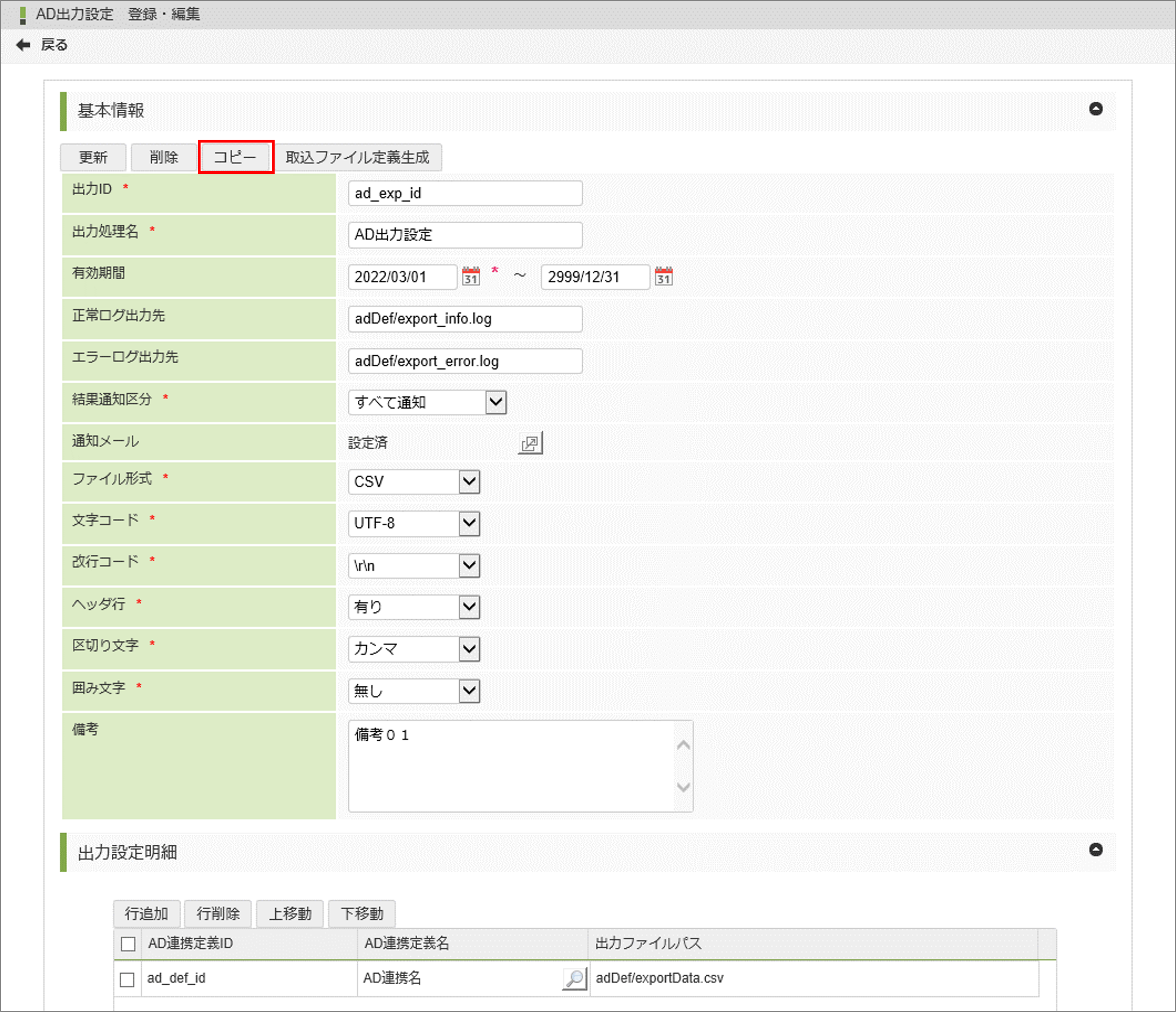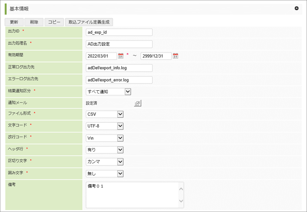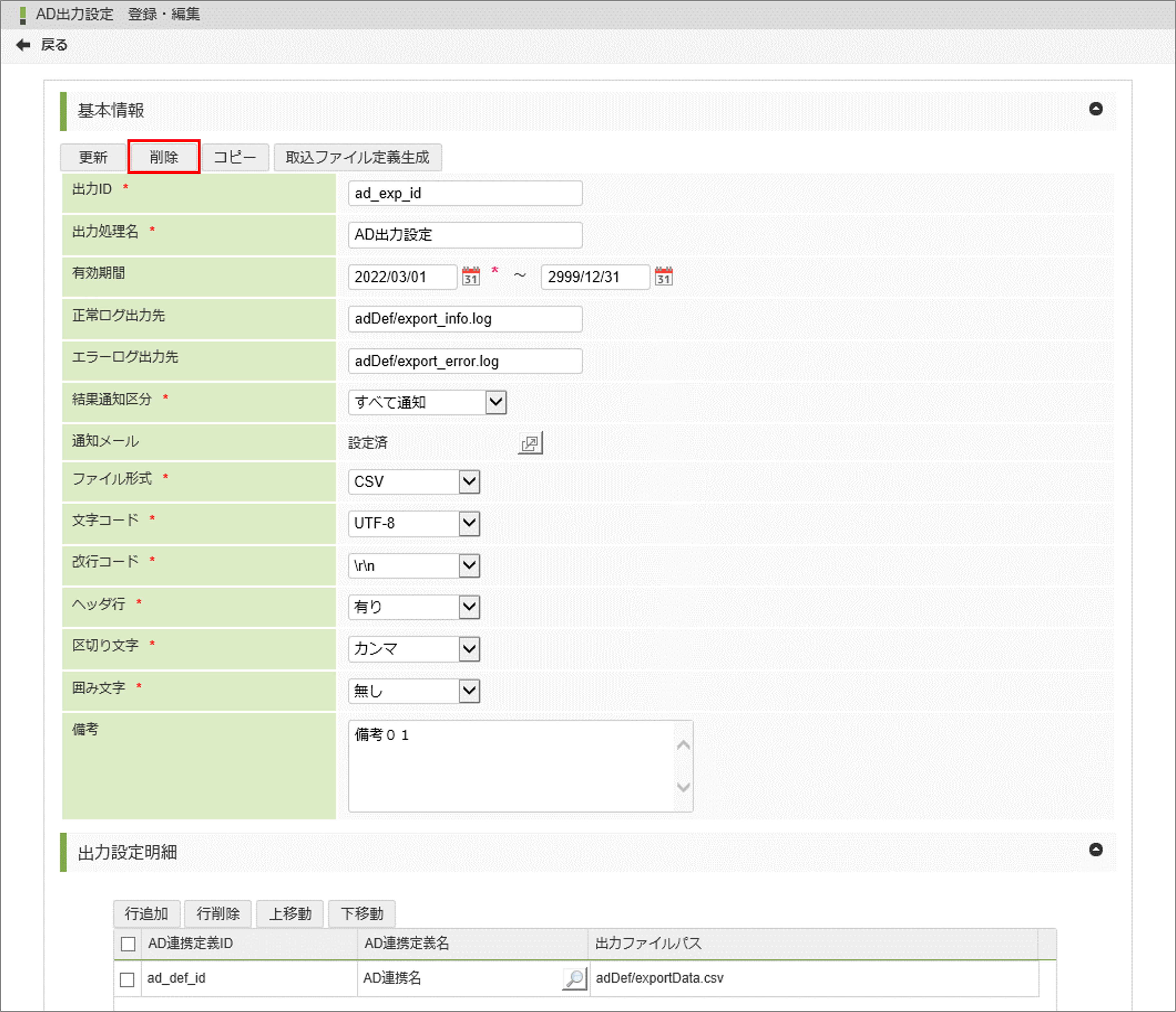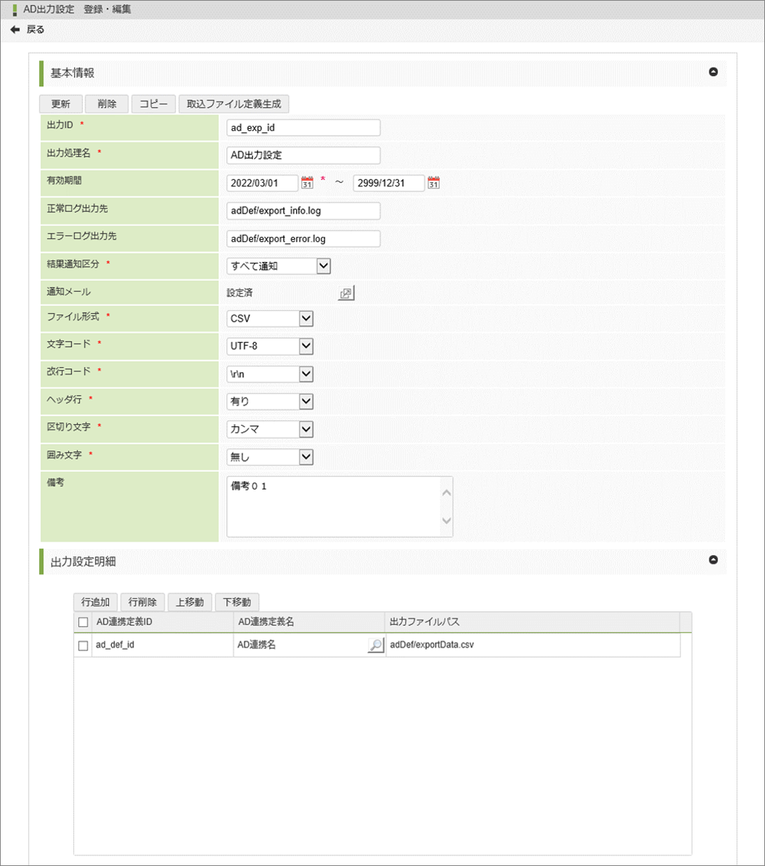 更新ボタン更新ボタンをクリックすると、設定されている情報で更新処理を実行します。 削除ボタン削除ボタンをクリックすると、AD出力設定の削除処理を実行します。 コピーボタンコピーボタンをクリックすると、表示されているAD出力設定の出力IDと出力処理名以外の内容をコピーし、AD出力設定登録画面に遷移します。 取込ファイル定義生成ボタン取込ファイル定義生成ボタンをクリックすると出力設定明細で選択されたAD連携定義の項目明細を基に取込ファイル定義を作成します。 出力ID(編集不可)出力IDを入力します。 出力処理名(必須)出力処理名を入力します。 有効期間 開始日(必須)有効期間 開始日を設定します。 有効期間 終了日(任意)有効期間 終了日を設定します。未設定のまま登録した場合、intra-mart上のシステム最大日付が自動的に登録されます。 正常ログ出力先(任意)正常ログ出力先を入力します。 エラーログ出力先(任意)エラーログ出力先を入力します。 結果通知区分(必須)結果通知区分を選択します。 通知メール(条件必須/編集可)通知メール設定状態が表示されます。設定アイコンをクリックすると、通知メール設定画面がポップアップ表示され通知メールを設定することができます。結果通知区分で「通知しない」を選択した場合でも通知メールのみ設定することも可能です。但し、結果通知区分で「通知しない」以外を選択した場合は、通知メール設定画面で「送信先メールアドレス」の「To:」に1件以上設定する必要があります。 ファイル形式(必須)ファイル形式を選択します。 文字コード(必須)文字コードを選択します。 改行コード(必須)改行コードを選択します。 ヘッダ行(必須)ヘッダ行の有無を選択します。 区切り文字(必須)区切り文字を選択します。 囲み文字(必須)囲み文字を選択します。 備考(任意)備考を入力します。