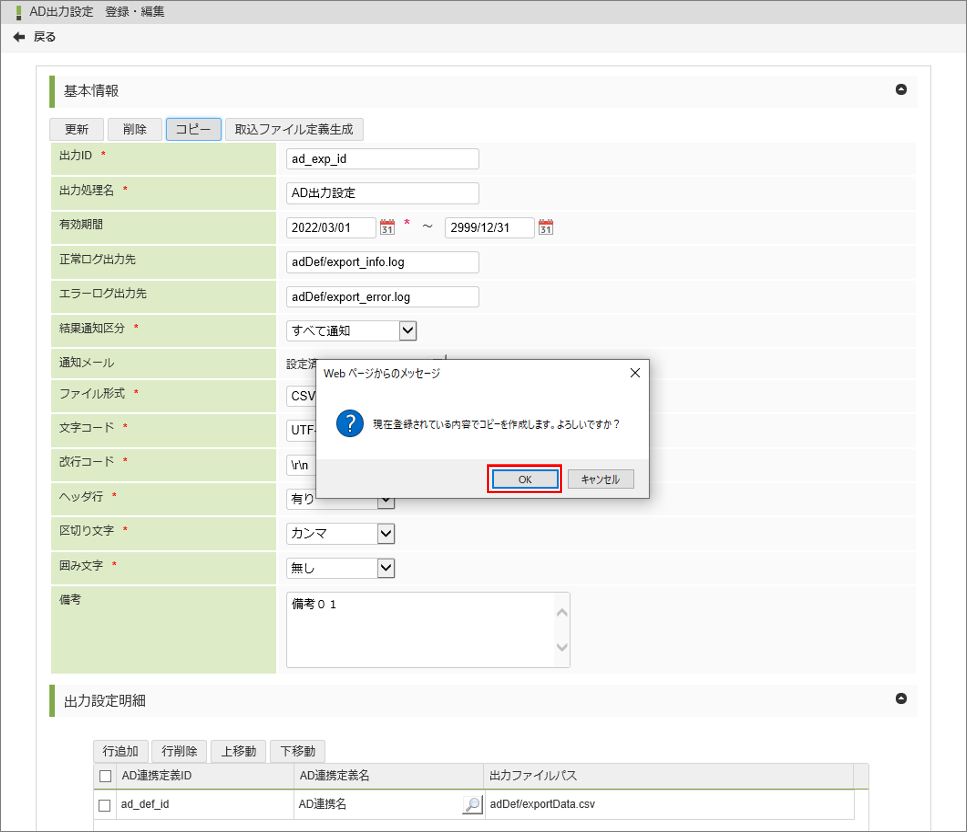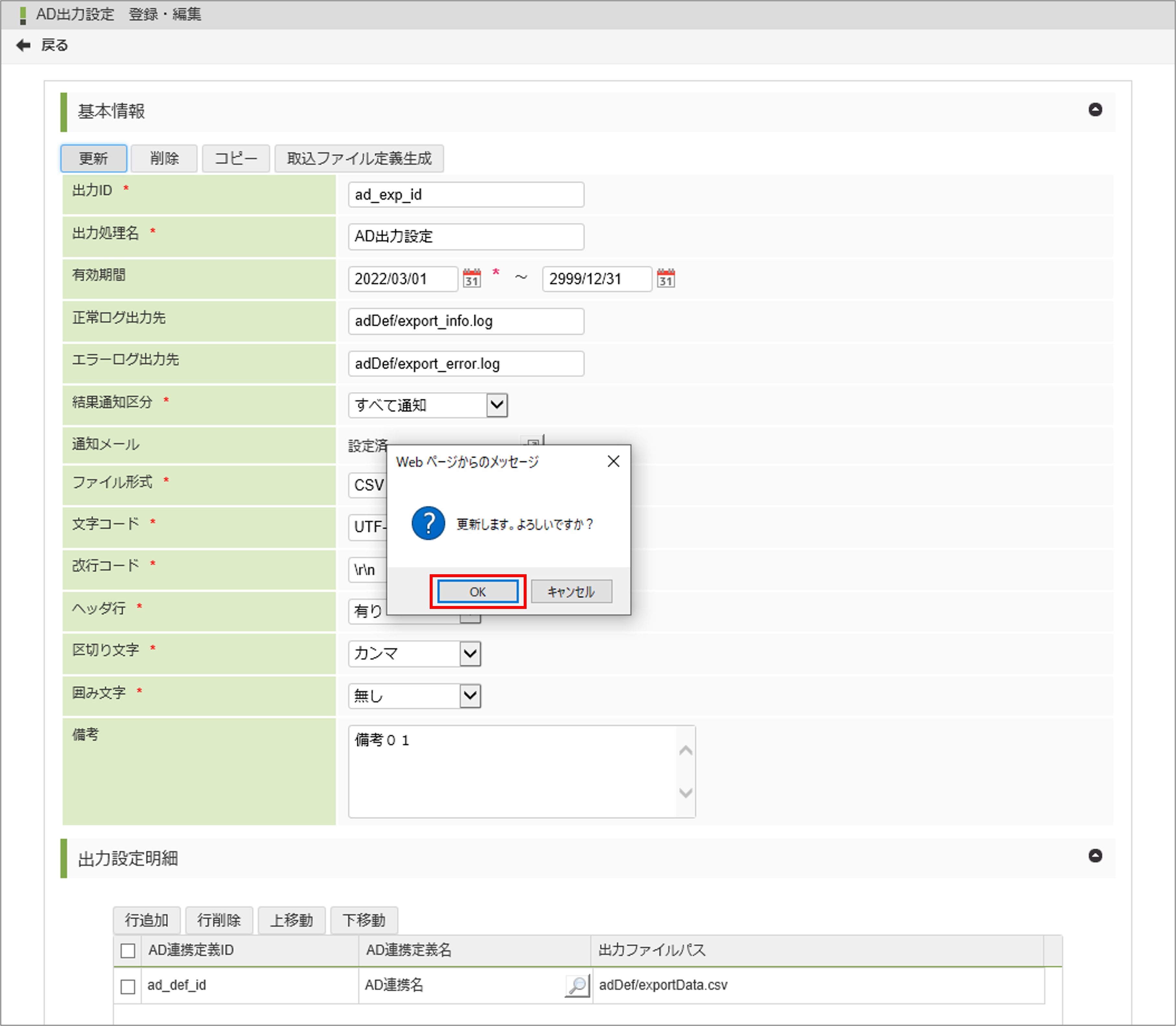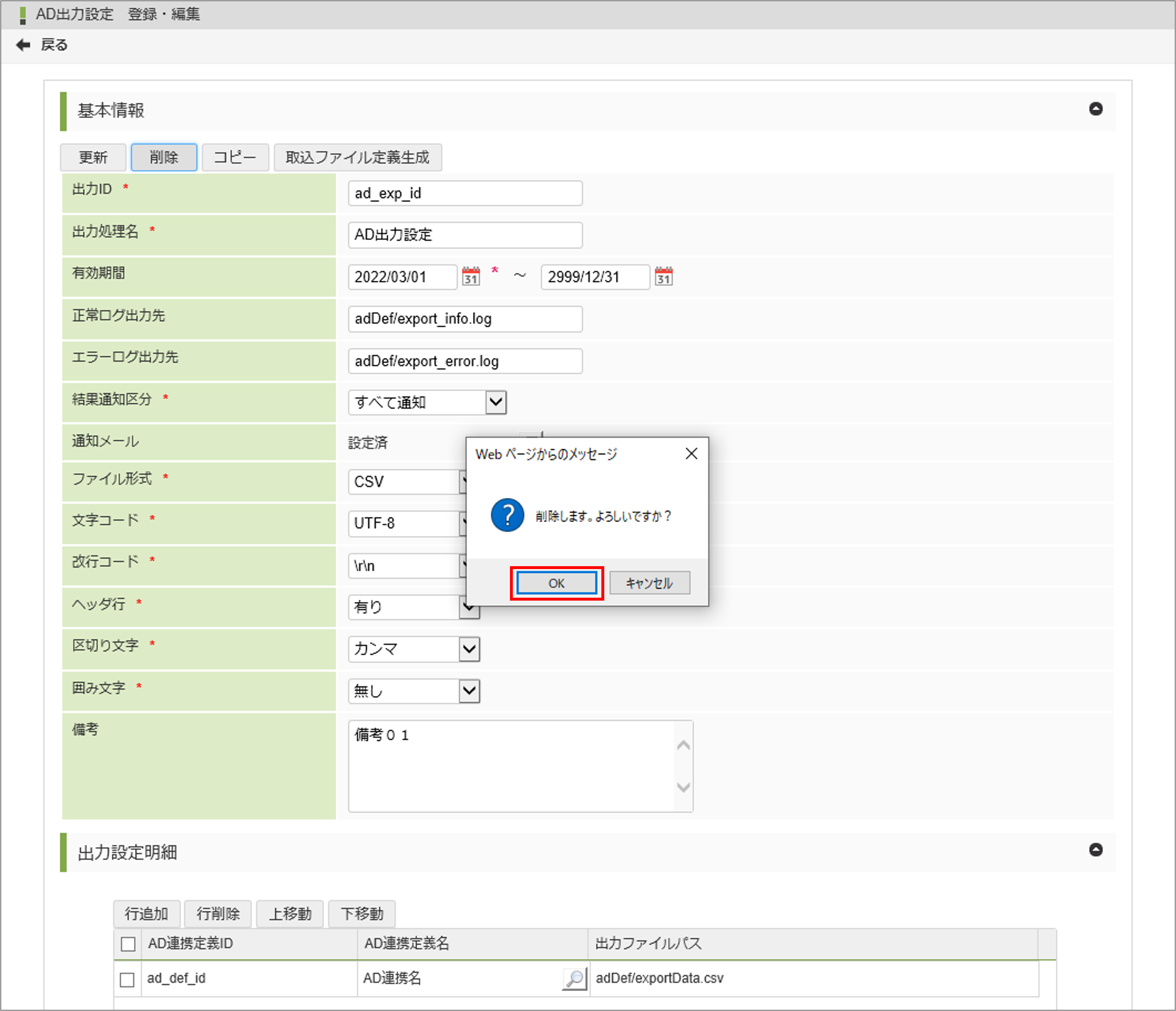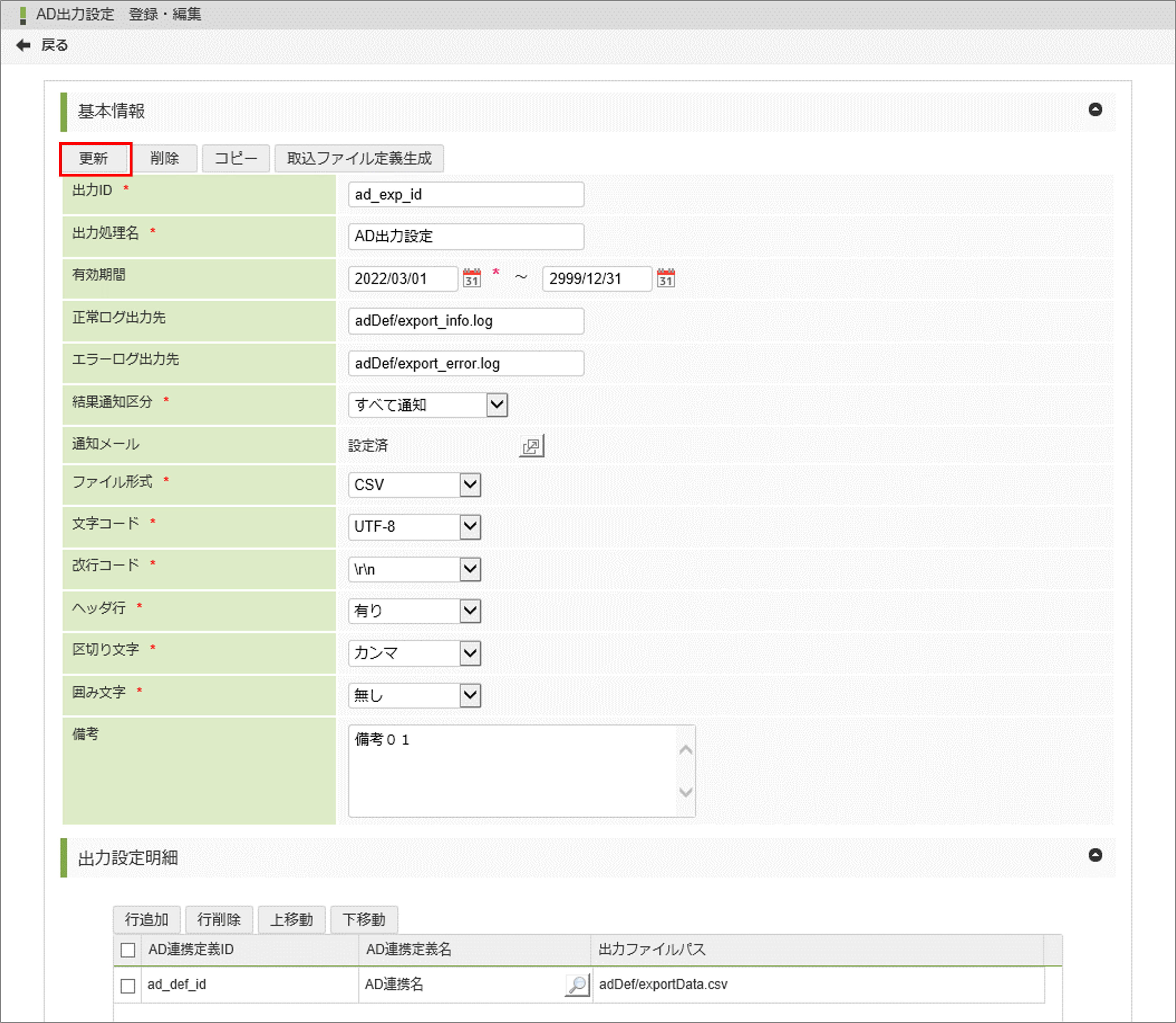 更新ボタン更新ボタンをクリックすると、設定されている情報で更新処理を実行します。 削除ボタン削除ボタンをクリックすると、AD出力設定の削除処理を実行します。 コピーボタンコピーボタンをクリックすると、表示されているAD出力設定の出力IDと出力処理名以外の内容をコピーし、AD出力設定登録画面に遷移します。 取込ファイル定義生成ボタン取込ファイル定義生成ボタンをクリックすると出力設定明細で選択されたAD連携定義の項目明細を基に取込ファイル定義を作成します。 出力ID(編集不可)出力IDを入力します。 出力処理名(必須)出力処理名を入力します。 有効期間 開始日(必須)有効期間 開始日を設定します。 有効期間 終了日(任意)有効期間 終了日を設定します。未設定のまま登録した場合、intra-mart上のシステム最大日付が自動的に登録されます。 正常ログ出力先(任意)正常ログ出力先を入力します。 エラーログ出力先(任意)エラーログ出力先を入力します。 結果通知区分(必須)結果通知区分を選択します。 通知メール(条件必須/編集可)通知メール設定状態が表示されます。設定アイコンをクリックすると、通知メール設定画面がポップアップ表示され通知メールを設定することができます。結果通知区分で「通知しない」を選択した場合でも通知メールのみ設定することも可能です。但し、結果通知区分で「通知しない」以外を選択した場合は、通知メール設定画面で「送信先メールアドレス」の「To:」に1件以上設定する必要があります。 ファイル形式(必須)ファイル形式を選択します。 文字コード(必須)文字コードを選択します。 改行コード(必須)改行コードを選択します。 ヘッダ行(必須)ヘッダ行の有無を選択します。 区切り文字(必須)区切り文字を選択します。 囲み文字(必須)囲み文字を選択します。 備考(任意)備考を入力します。