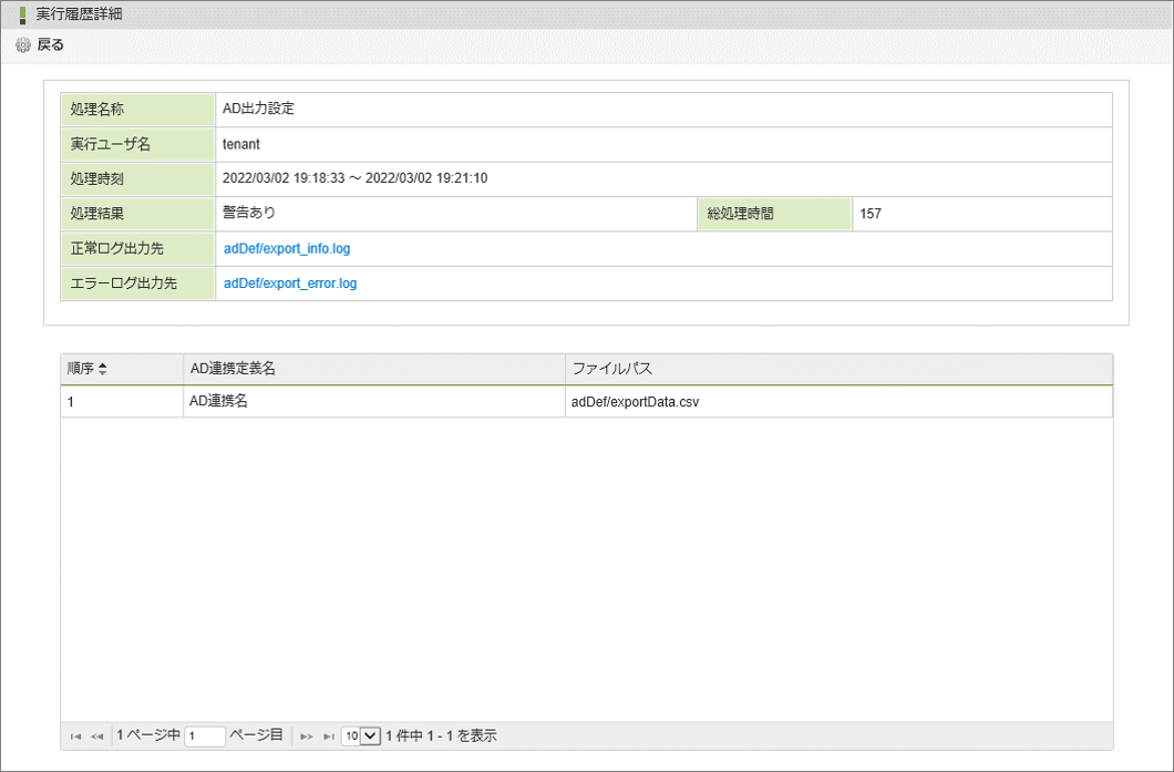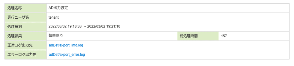 実行履歴の詳細を表示します。 処理名称 処理名称を表示します。 実行ユーザ名 実行ユーザ名を表示します。 処理時刻 処理時刻(開始日時~終了日時)を表示します。 処理結果 処理結果(正常終了/異常終了/警告あり)を表示します。 総処理時間 総処理時間(秒)を表示します。 正常ログ出力先 正常ログ出力先を表示します。 ファイルパスリンクをクリックすると、ログファイルをダウンロードできます。 エラーログ出力先 エラーログ出力先を表示します。 ファイルパスリンクをクリックすると、ログファイルをダウンロードできます。